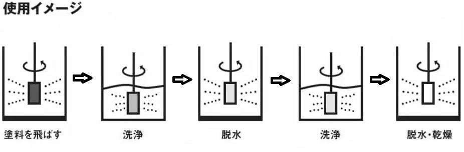 洗浄前に遠心力で塗料を吹き飛ばすので、洗浄に必要な水も少なく済み、手洗い洗浄より短い洗浄時間で再利用できる状態になります。ここまで一連の洗浄作業に要した時間は30秒程度でした。